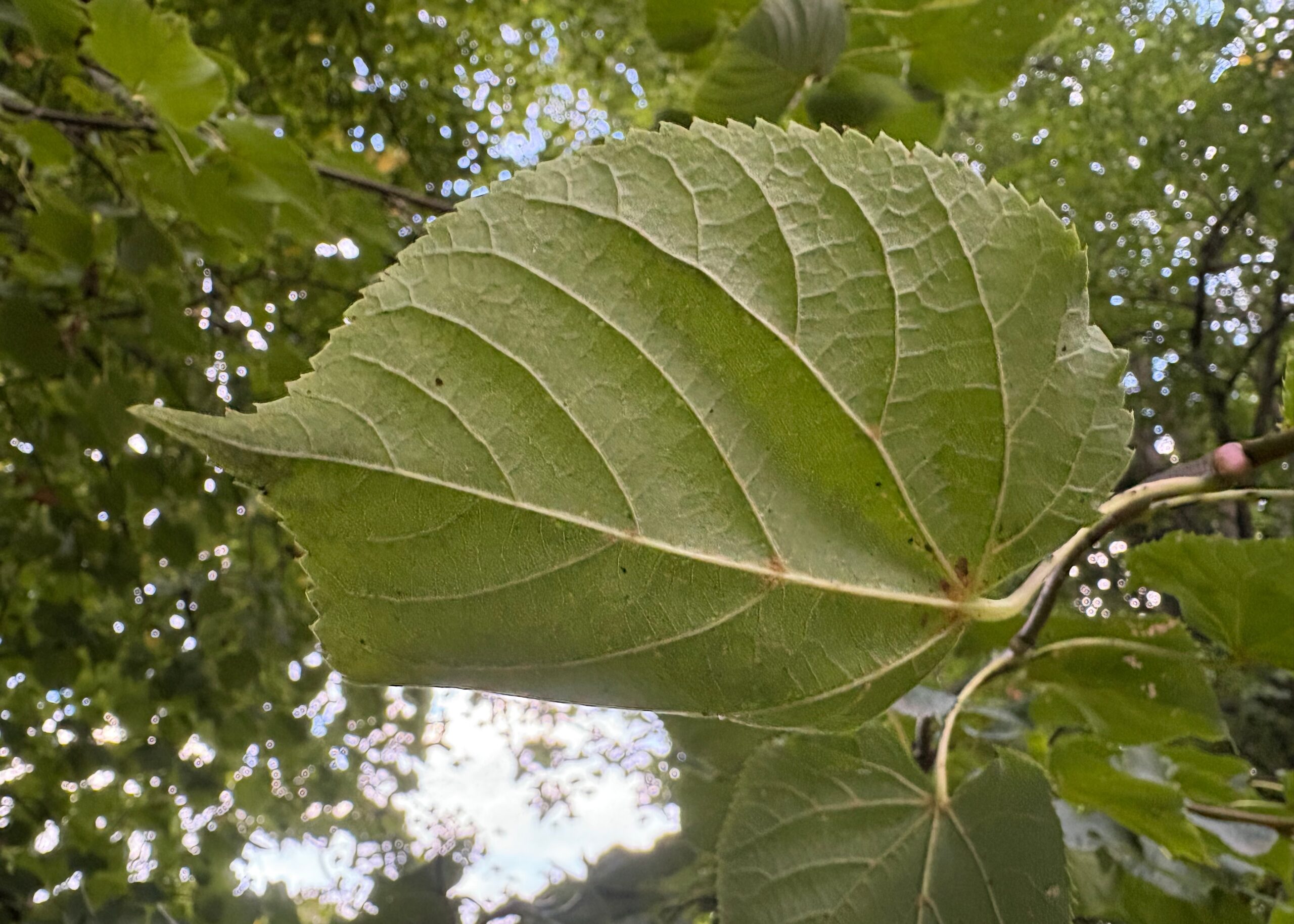 liść okrągłosercowaty, na brzegu piłkowany, na górnej stronie żywozielony, na dolnej jaśniejszy i z pęczkami rudych włosków w kątach nerwów